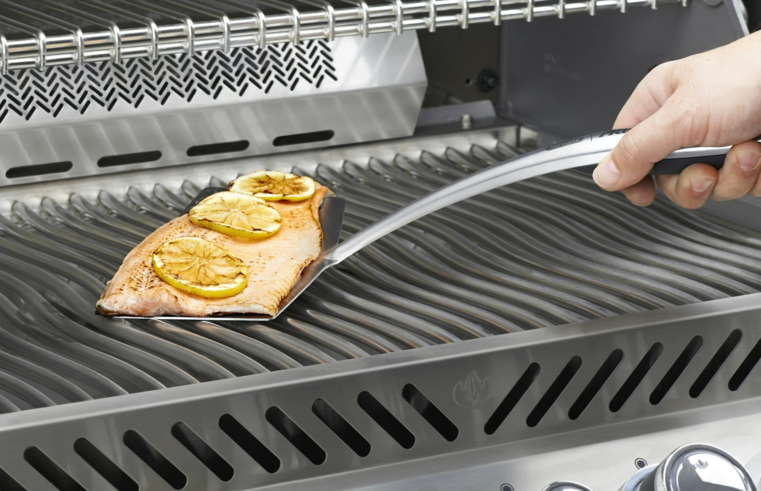 Der NAPOLEON Fischwender wird aus hochwertigem Edelstahl gefertigt. Der Fischwender ist optimal geeignet um große Fischstücke sicher zu wenden. Seitlich befinden sich abgeschrägte Kanten, so dass er ganz einfach unter das Fischfilet geschoben werden kann. Mit der integrierten Schneidkante können Sie Ihr Fischfilet bereits auf dem Grill einfach portionieren. Im Griff ist eine Halte-Öse und ein Flaschenöffner integriert. Der NAPOLEON Fischwender ist „spülmaschinen-tauglich“.