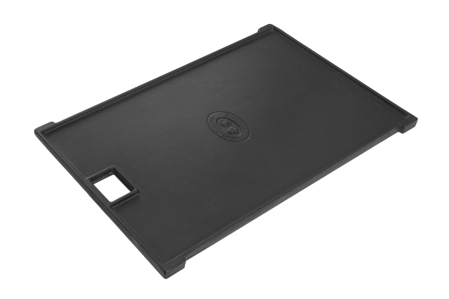 Für den Grillprofi: großflächige Gusseisen Grillplatte mit glatter und gerippter Seite. Speichert die Hitze und verteilt sie gleichmäßig über die ganze Platte.